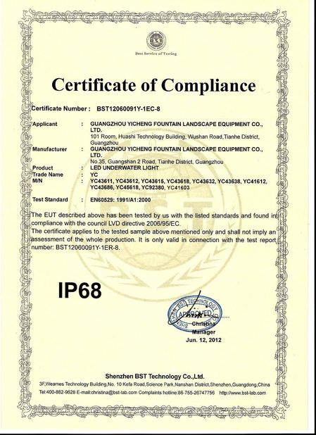 पानी के फव्वारे, स्विमिंग पूल, एक्वैरियम और वॉटर पार्क उपकरण के लिए हमारे गुणवत्ता मानक को बेहतर बनाने, सख्त नियंत्रण और सही करने के लिए, हमें कई प्रमाण पत्र, जैसे सीई, एसजीएस, आरओएचएस, सीसीसी, एएए और आईओएसओ आदि मिले।