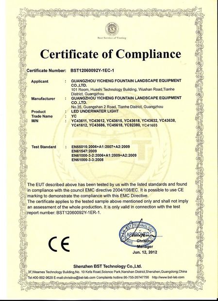 मानक:CE certificate संख्या:BST12060092Y-1EC-1 मुद्दा तिथि:2012-06-12 समाप्ति दिनांक:2020-06-12 कार्यक्षेत्र/श्रेणी:Underwater Light द्वारा जारी किया गया:Shenzhen BST Tehnology Co., Ltd |